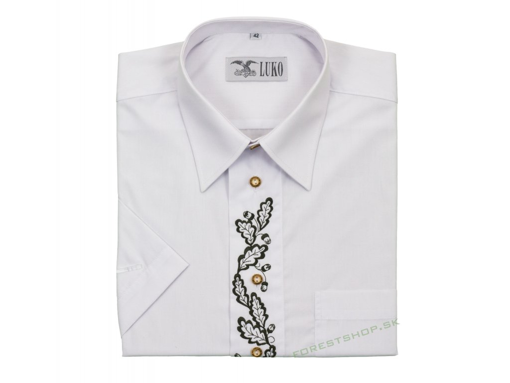 Popis: Pánska biela poľovnícka košeľa s krátkym rukávom a výšivkou tmavozelenej farby s dubovým motívom na lege