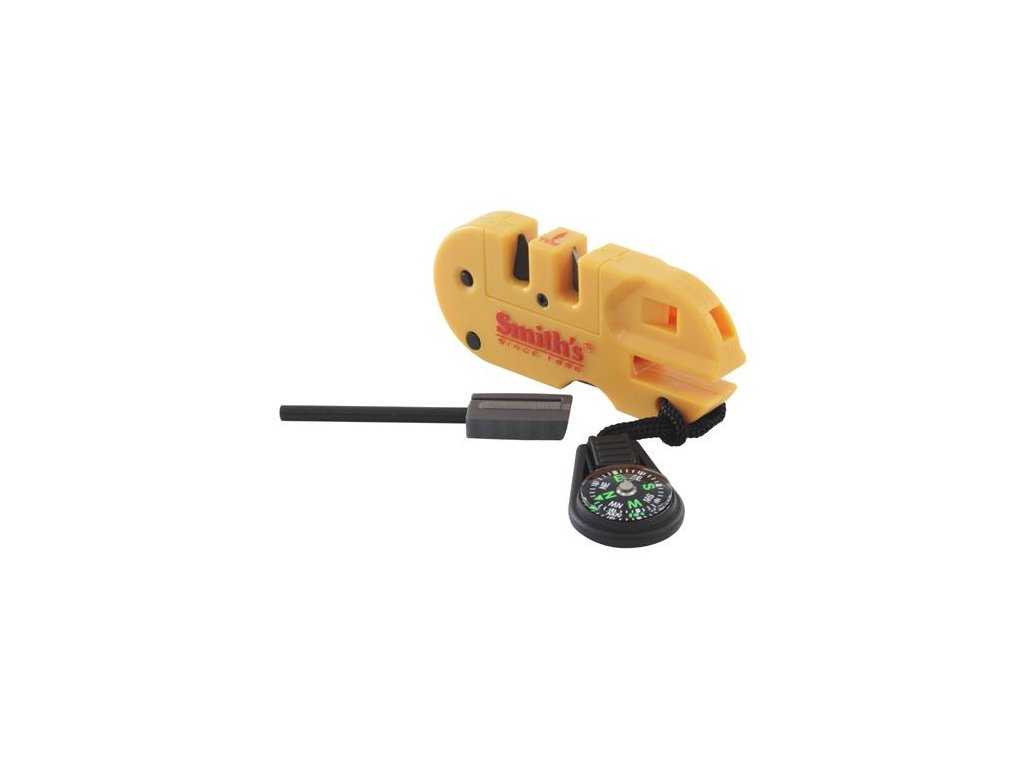 Outdoorový multifunkčný nástroj na brúsenie nožov s hladkou aj zubatou čepeľou, parákov, doplnený píšťalkou, LED svetlom, kompasom a trecím zapaľovačom.