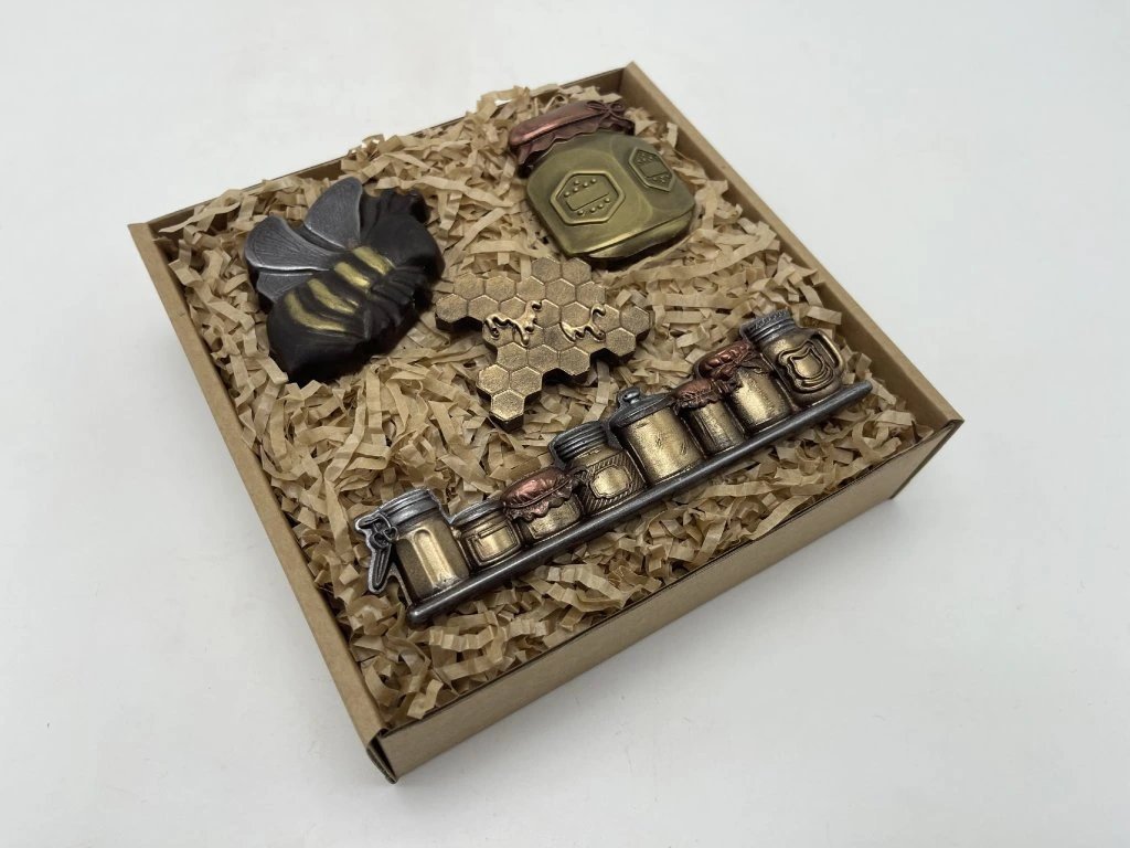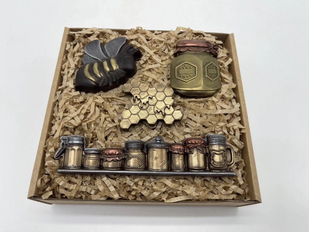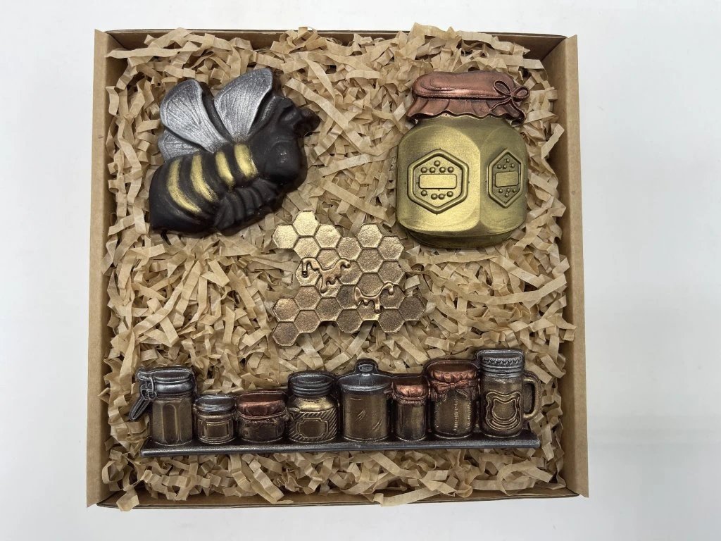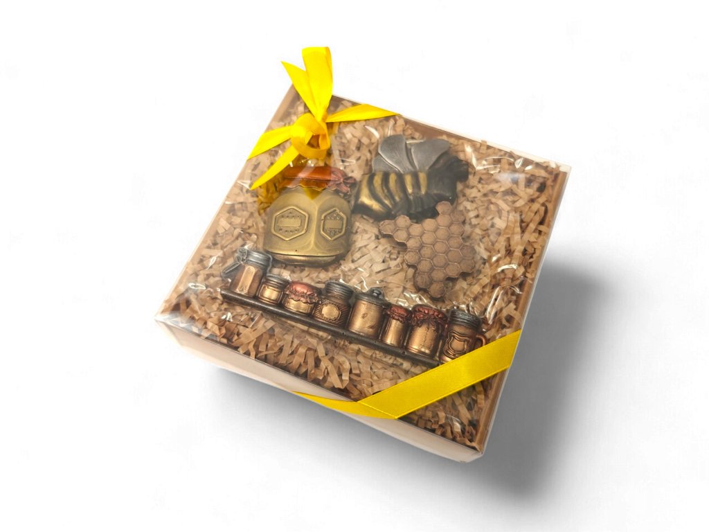 Vitajte v sladkom svete včiel, kde sa čokoláda mení na čarovný príbeh. Ručne maľované figúrky v podobe včielky, medového plástu, pohára medu a malých dóz očaria na prvý pohľad – a potom sa krásne rozplývajú na jazyku.