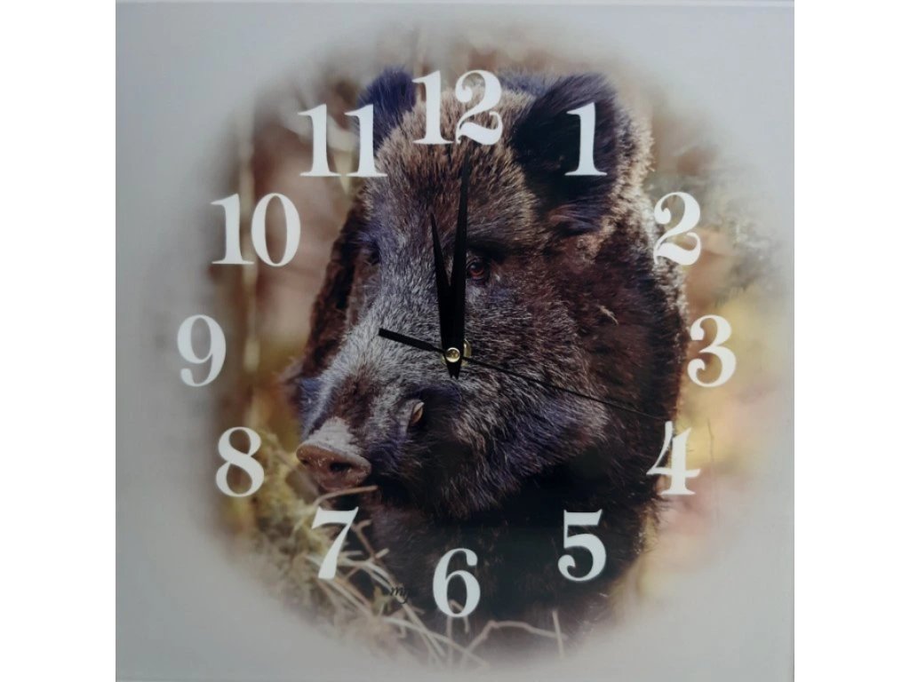 Štýlové nástenné hodiny s motívom diviaka vyrobené z 3 mm plexiskla. Moderný doplnok do domácnosti, kancelárie či poľovníckej izby.