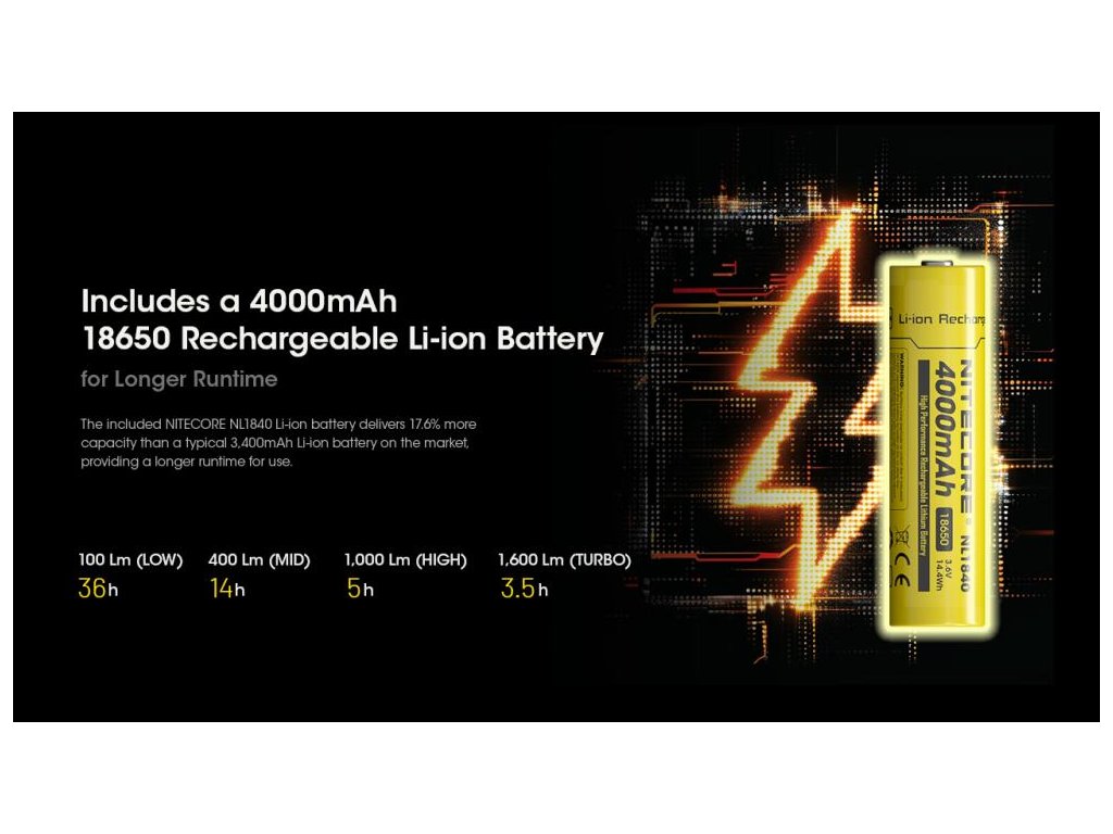 Kapacita akumulátora: 4000 mAh (Li-ion 18650 súčasťou balenia),umožňuje dobu prevádzky až 200 hodín